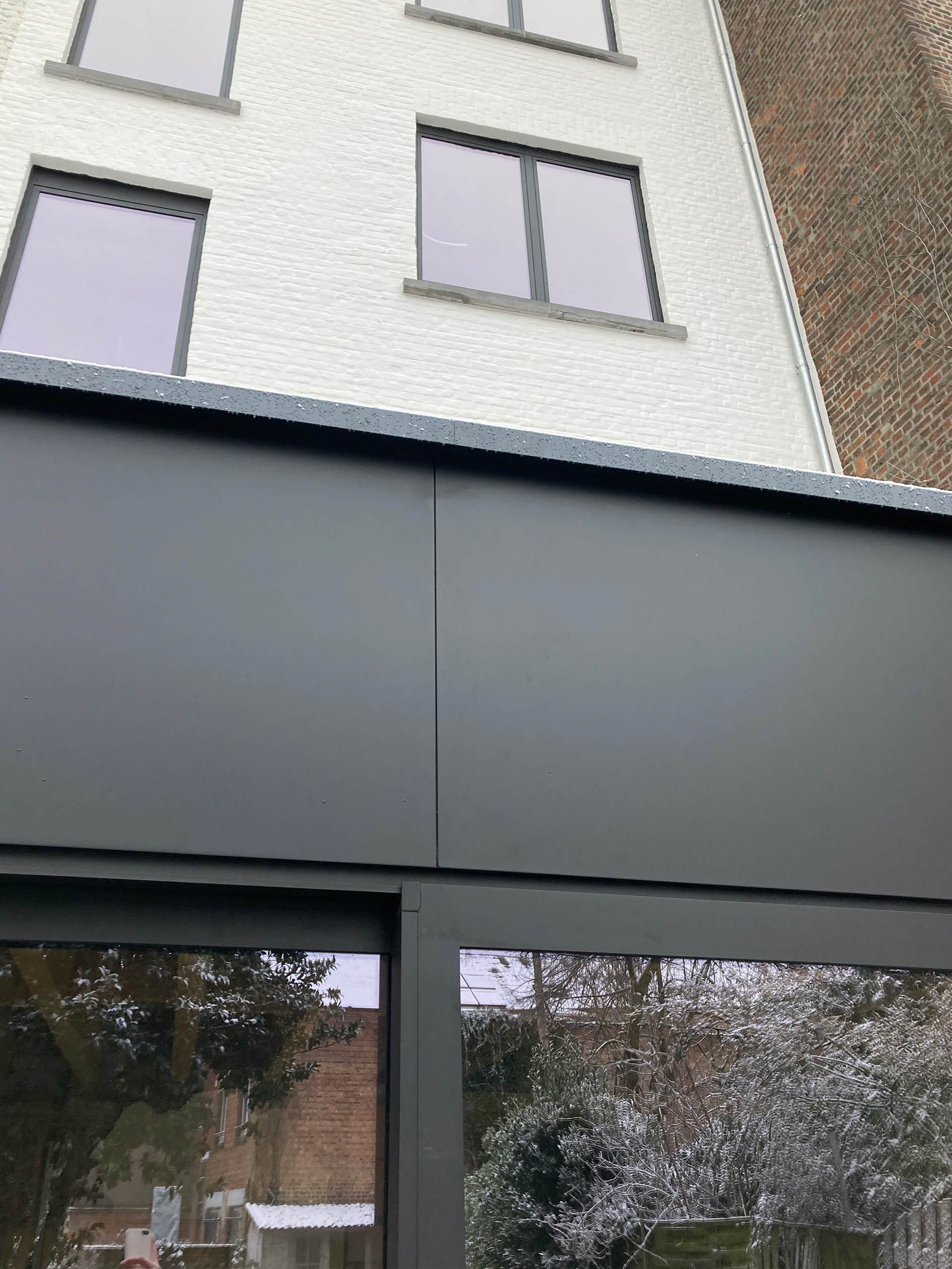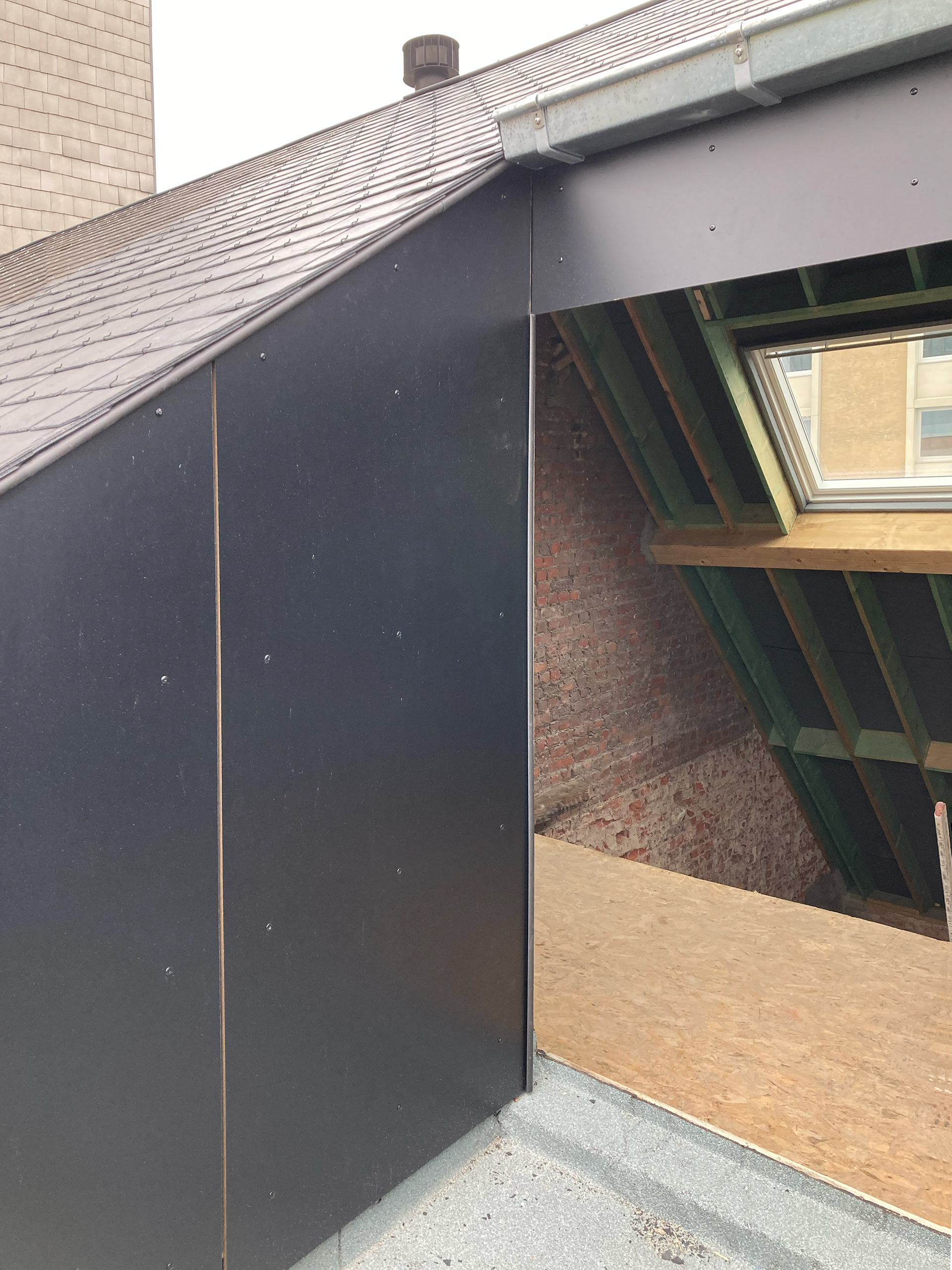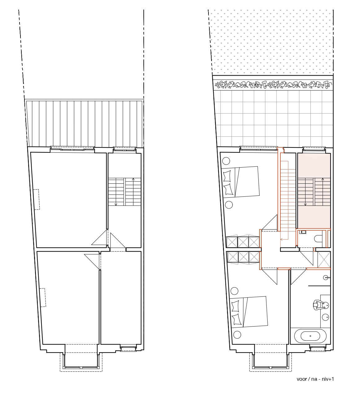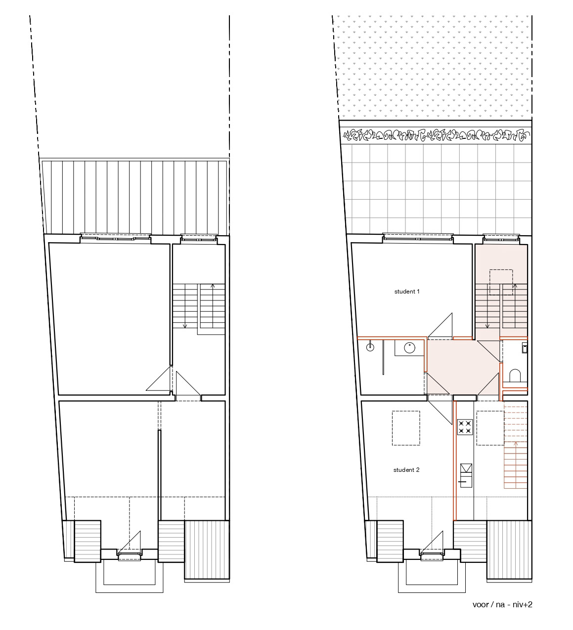 Een statige eengezinswoning wordt opgedeeld in een triplexwoning en een duplex met studentenkamers. Het bestaande volume blijft grotendeels behouden, met een uitbreiding aan de tuinzijde. De traphal blijft behouden als gemeenschappelijke circulatie, terwijl de triplex wordt georganiseerd rond twee interne trappen. De lager gelegen tuinverdieping wordt ingericht als leefruimte. Een nieuwe aanbouw vervangt de veranda en opent zich met een grote raampartij naar de tuin. Het dak wordt ingericht als terras, waardoor ook het gelijkvloers rechtstreeks aansluit op buiten. Onder het hellend dak worden twee studentenkamers en gedeelde voorzieningen ingericht. Aan de voorzijde openen een kamer en de keuken zich tot in de nok. Vanuit de keuken is er toegang tot een extra verdiepje met een inpandig dakterras. De voorgevel, opgenomen in de erfgoedinventaris wordt zorgvuldig gerestaureerd en voorzien van houten schrijnwerk. Achteraan wordt de gevel gekaleid en voorzien van nieuw aluminium schrijnwerk. De aanbouw sluit hierop aan met een strakke aluminium gevelafwerking. Zo krijgt een ruim herenhuis tegenover het station een nieuwe invulling.